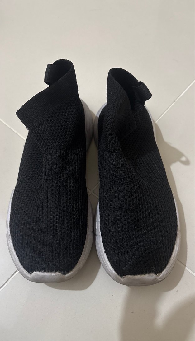 Siyah, elastik üst yüzeyli spor ayakkabı. Sokak stili için uygun, desen içermeyen koyu renkte ve günlük kullanım için kauçuk tabanlı. Çok rahattır. Sayılı giyildi.