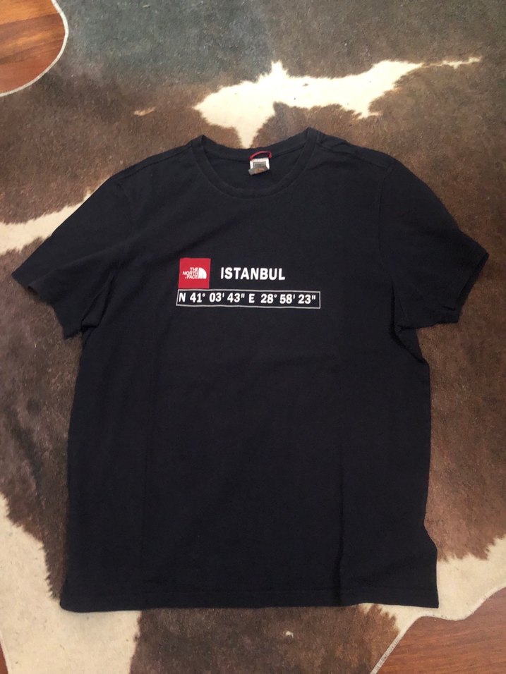Siyah, oversize kesim, yuvarlak yakalı tişört. "ISTANBUL" ve koordinat baskılı, sentetik kumaştan yapılmış rahat sokak stili tişört. ✨