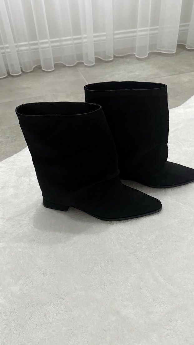 Siyah süet malzemeden yapılmış, kadın botları. Minimalist ve gotik tarzda, desen içermeyen bu botlar günlük ve özel kullanım için zahmetsiz şıklık sunar.
