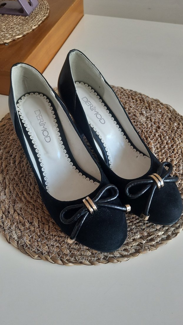 Derimod marka, siyah süet dolgu topuklu kadın ayakkabısı. Ön kısmında fiyonk detayı bulunan klasik ve desensiz model, günlük kullanıma uygundur. ERIMOD, 10D.