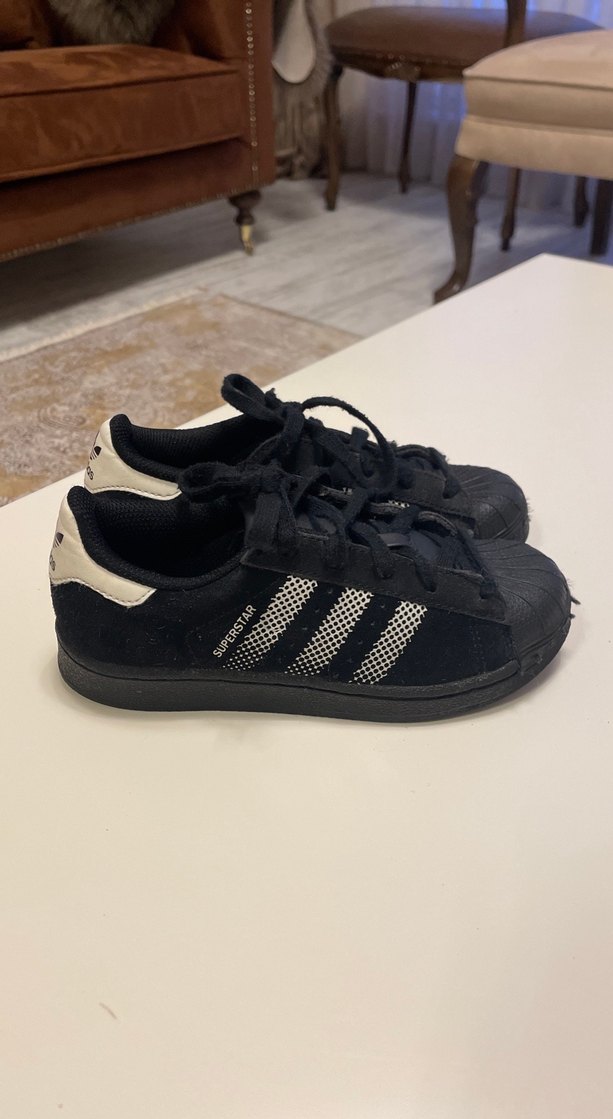 Siyah süet Adidas Superstar erkek çocuk sneakers, beyaz çizgili detaylar ve düz tabanlı, sportif sokak stili tasarım 30,5 numaradır