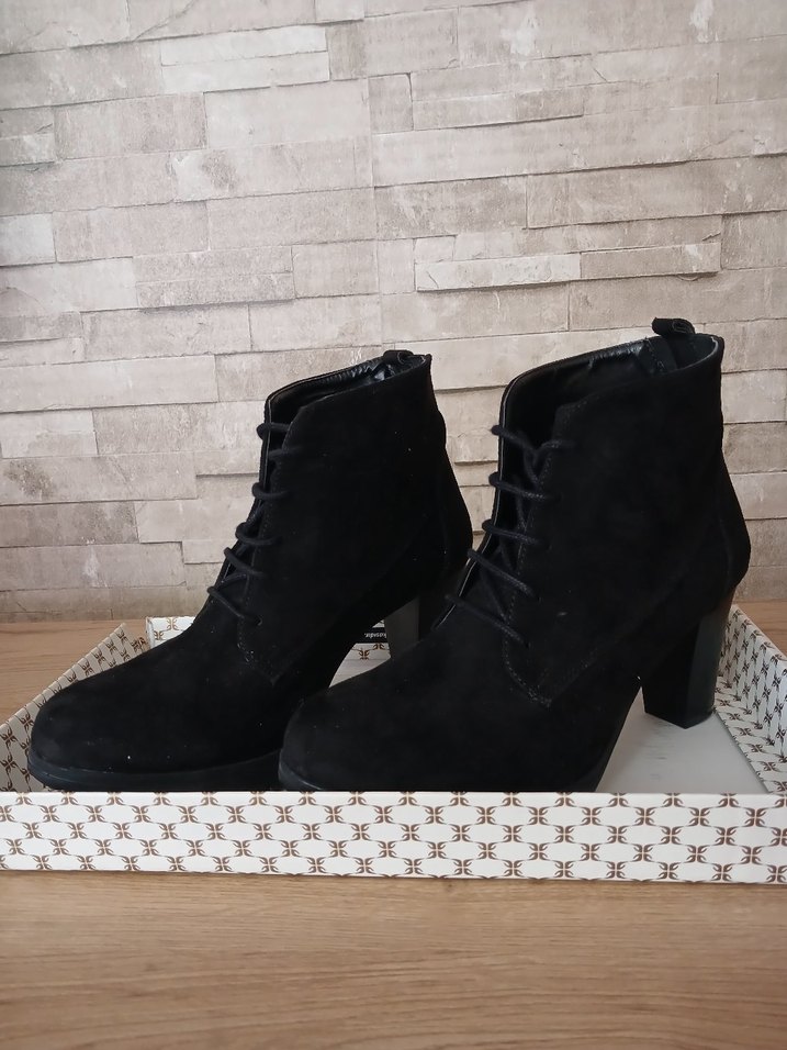 Siyah süet malzemeden yapılmış, blok topuklu ve bağcıklı tasarıma sahip,goth tarzı bot.6 cm topuk,hic giyilmedi,temiz❤️