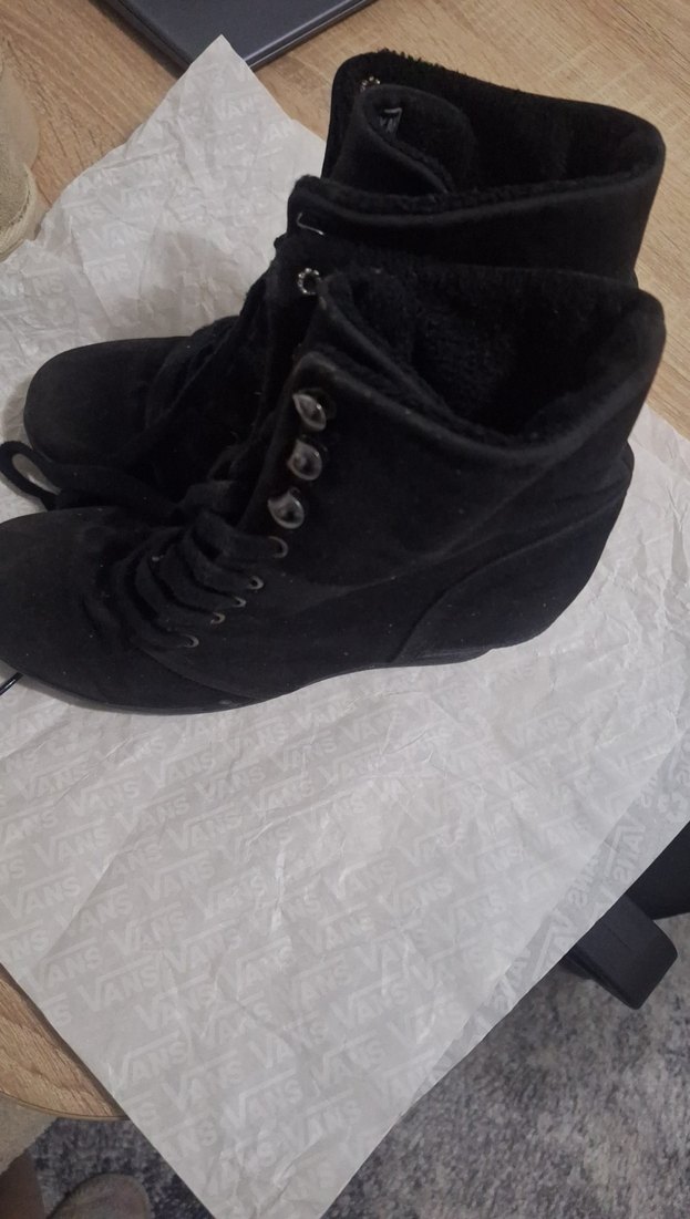 Artık kullanmadığım için satılık. Siyah süet malzemeden yapılmış, bağcıklı dolgu topuklu botlar. Rahat ve gotik tarzıyla günlük kullanıma uygundur.