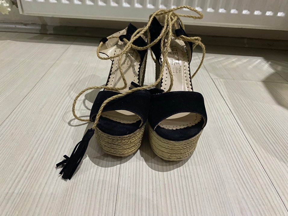 Siyah süet malzemeden yapılmış, bağcıklı ve yılan desenli bohem tarzda dolgu topuklu kadın ayakkabısı. Örgü dolgu topuk doğal bir görünüm sağlar.