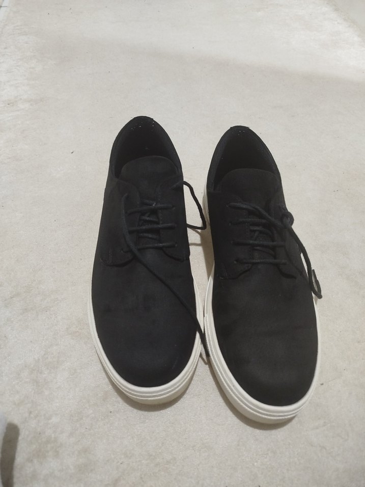 Siyah süet malzemeden yapılmış, bağcıklı erkek sneaker. Beyaz tabanlı ve günlük sokak stiline uygun. mezuniyette 1 kere giyildi #erkek #siyah #43