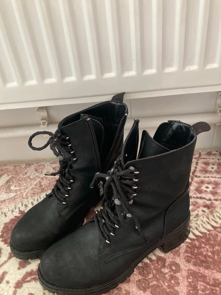 Siyah süet, bağcıklı ve tokalı, blok topuklu gotik tarzda kadın bot. Günlük kullanım için uygun, desensiz ve sağlam yapıda.