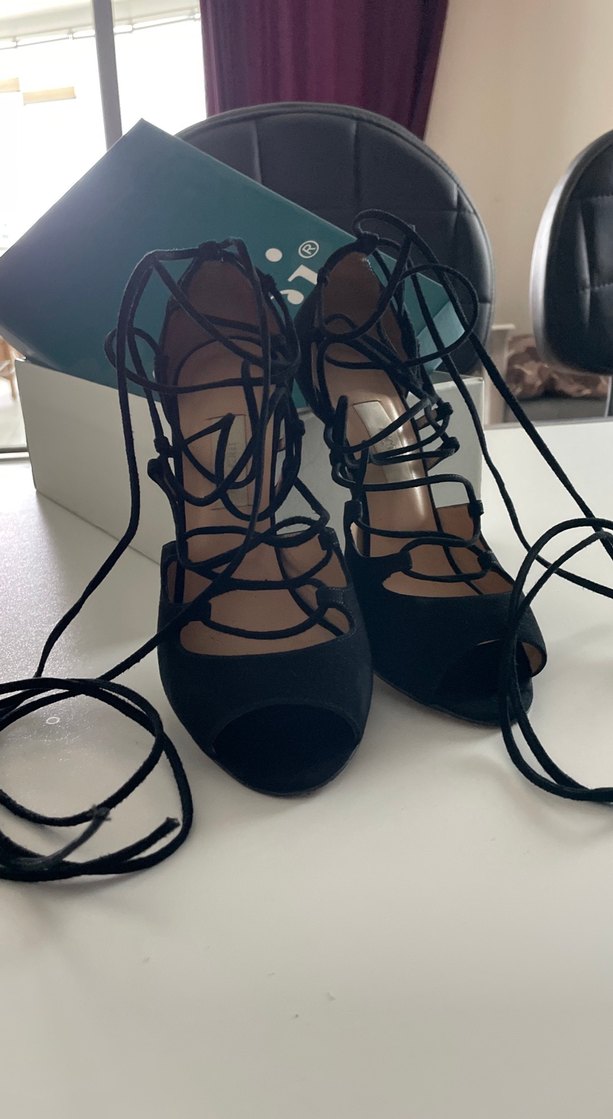 Siyah süet malzemeden, ince topuklu ve bağcıklı detaylara sahip kadın ayakkabıları, romantik gece için gotik Paris tarzını yansıtıyor.