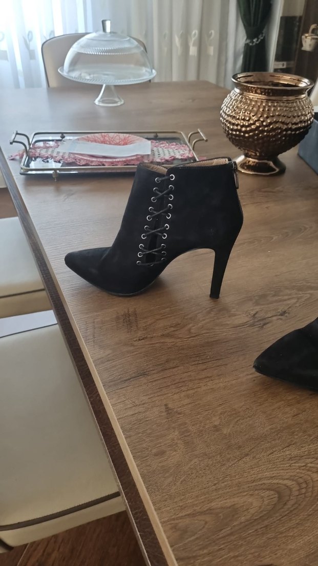 Siyah süet malzemeden yapılmış, ince topuklu ve bağcıklı kadın botu. Hafif yılan derisi deseni ile dikkat çeker, günlük kullanıma uygundur.