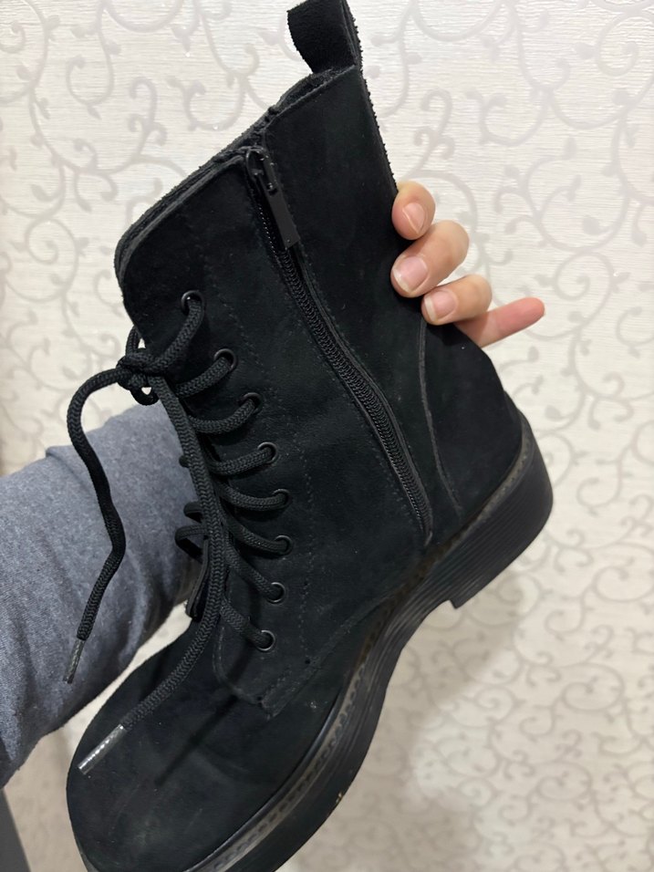 Siyah süet kadın çizmesi, stiletto topuklu ve bağcıklı, kolay kullanım için yan fermuarlı. Günlük kullanıma uygun, trend goth tarzında.