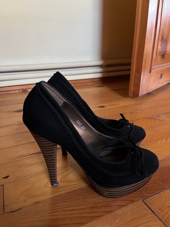 Siyah süet stiletto, bağcıklı ve desenli detaylara sahip, platform topuklu, gotik tarzda romantik akşamlar için uygun.