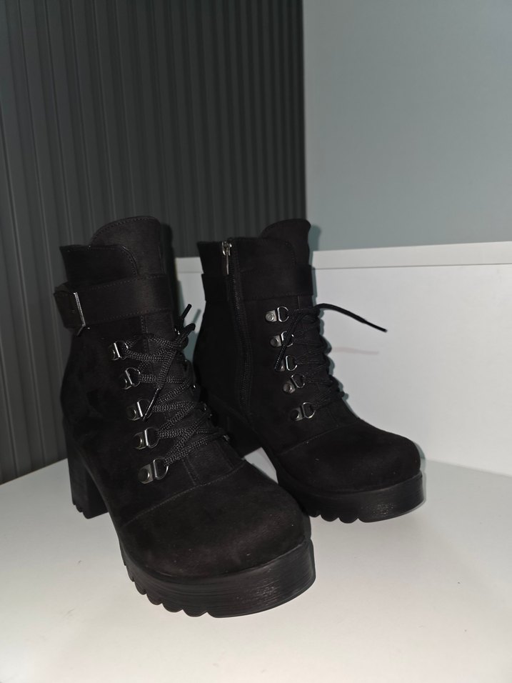 Koyu kamuflaj desenli, tokalı siyah süet botlar. Blok topuklu, günlük kullanıma uygun gotik punk tarzı.