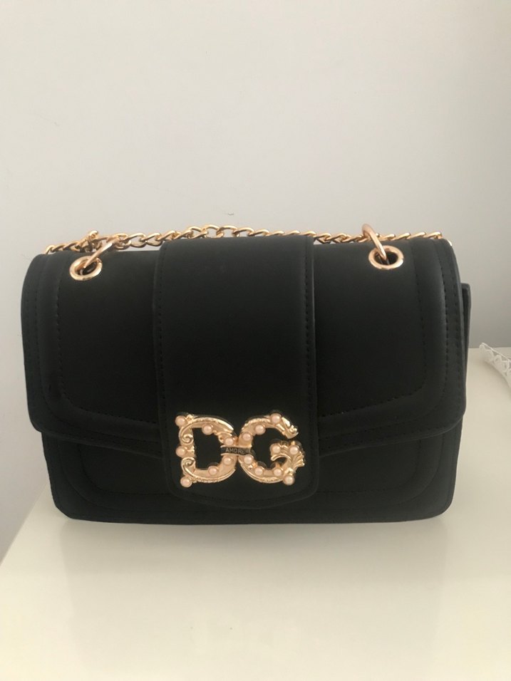 Siyah süet kadın çanta, buckled kapak ve altın zincir askıya sahip. DG baskılı logo ile romantik geceye uygun goth tarzı.