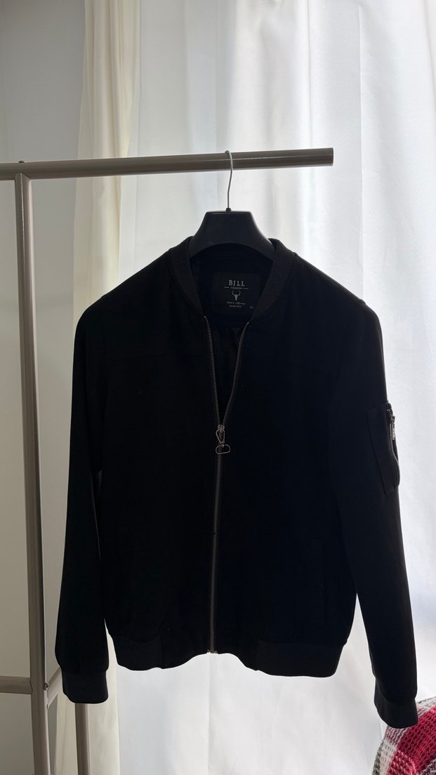 Siyah, süet kumaştan ve dar kesim ceket. Uzun kollu, bisiklet yaka ve günlük kullanıma uygun.
