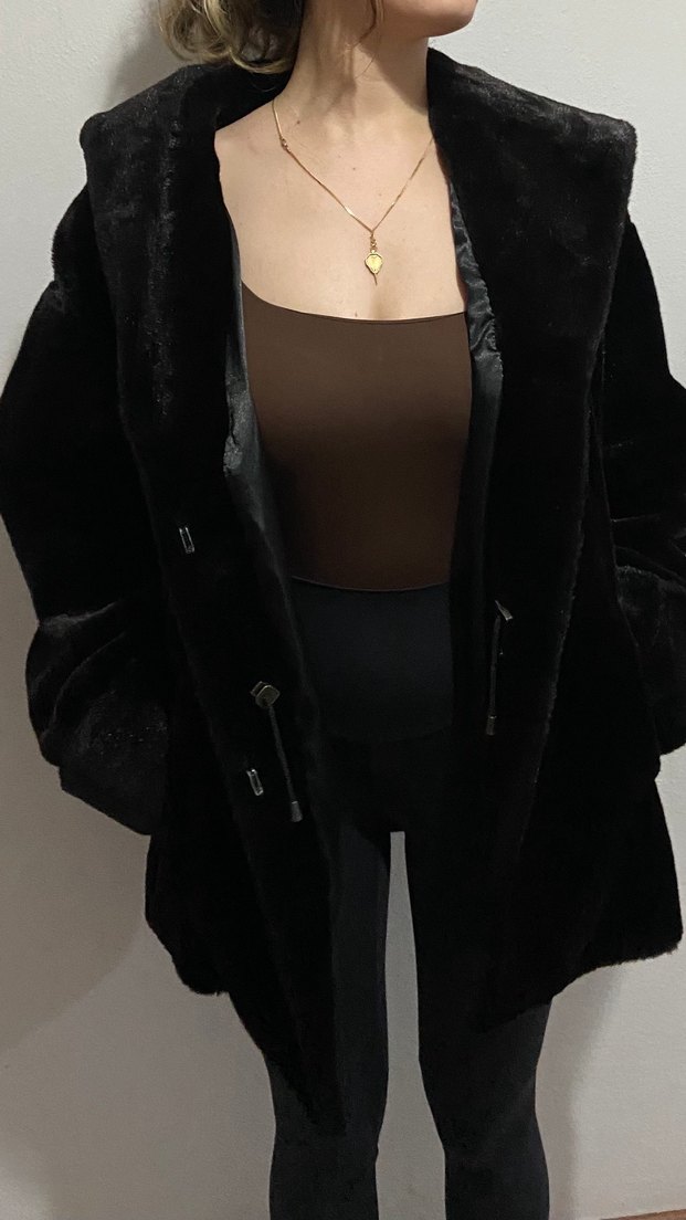 Siyah renkli, süet detaylı ve kürk görünümlü bu kaban, kesimiyle fit durur. Notched lapel yakası ve askılı kollarıyla günlük kullanıma uygundur.