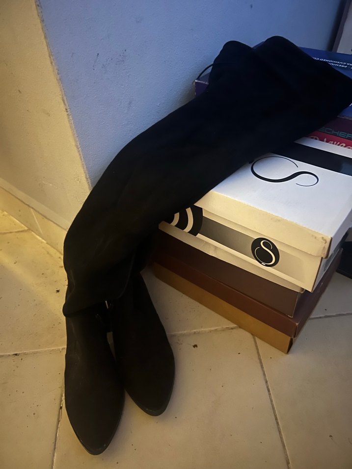 Siyah süet diz üstü botlar, stiletto topuklu ve tokalı detaylıdır. Sokak stiline uygun, günlük kullanım için idealdir.