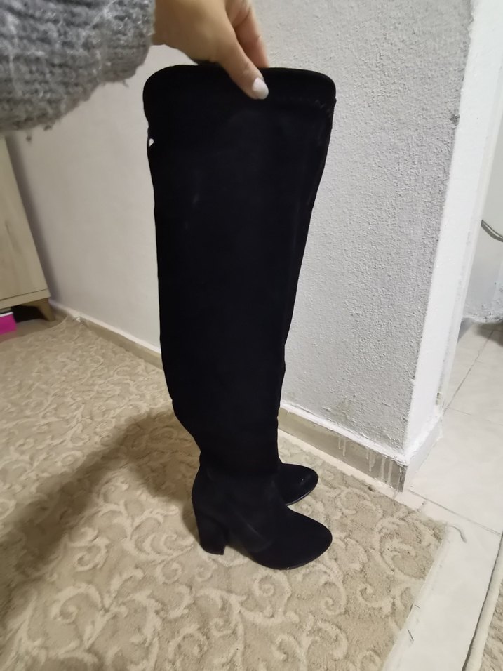 Siyah süet diz üstü çizme, kalın topuklu ve boyunu istediğiniz gibi büzüp ayarlayabilirsiniz uzunda kullanabilirsiniz. Ufak tefek deformasyon dışında sorun yok.