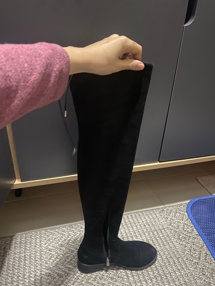 Siyah süet dizüstü botlar, fermuar kapama detaylıdır. Rahat ve gotik tarzda günlük kullanıma uygundur.