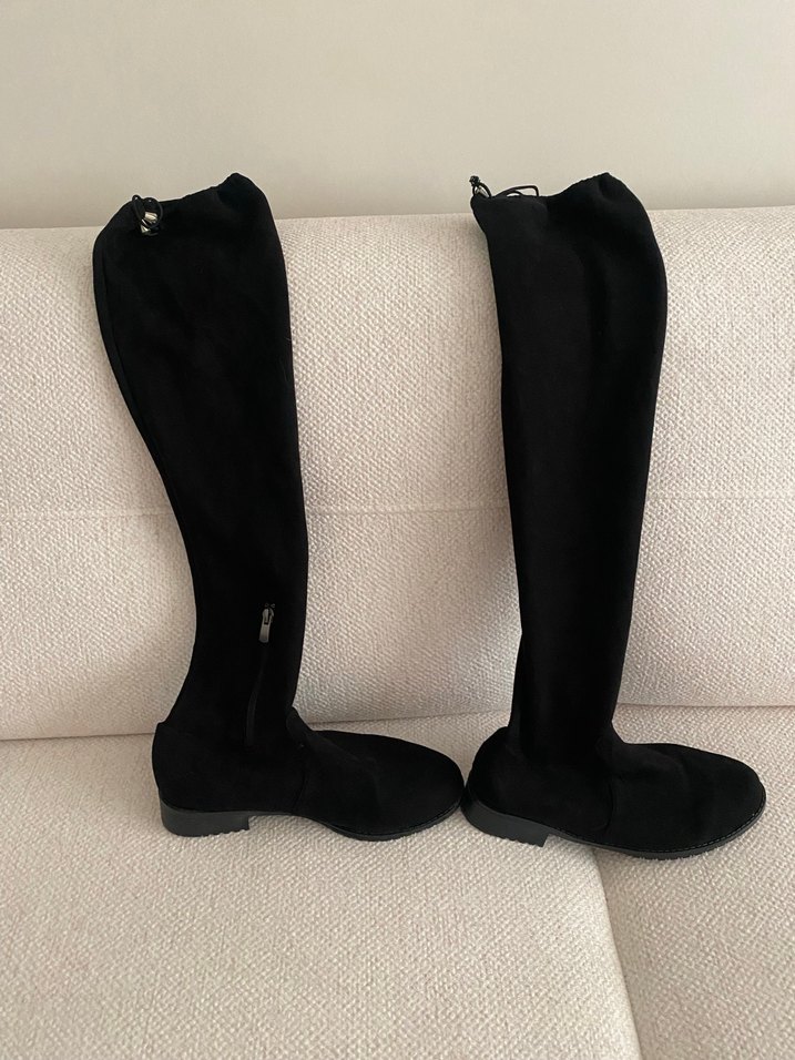 Siyah süet dizüstü stiletto topuklu çizmeler, yan fermuarlı ve minimalist gotik tarzda. Günlük kullanım için uygun. 39numara sar kalıp 38/39 uyumlu olucaktır