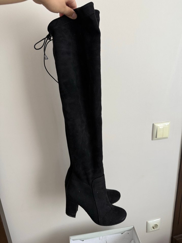 Siyah süet dizüstü stiletto topuklu, elastik detaylı çizme. Desensiz, gotik ve trend günlük stil karışımıdır, romantik buluşmalar için uygundur.