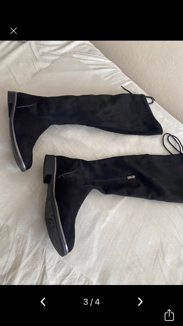 Siyah süet malzemeden dizüstü, stiletto topuklu botlar. Fermuar detaylı, desen içermeyen, şık ve rahat tasarım.