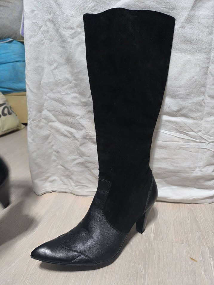 Siyah süet dizüstü çizme, stiletto topuklu ve tokalı detaylı, ofis kullanımı için uygun şık gotik tarzda. Rica marka 40 numara