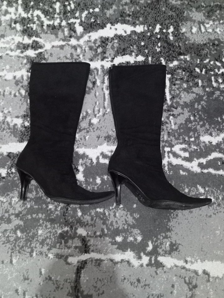 Siyah süet dizüstü çizme, topuklu ve kürk detaylı. Gotik tarzda, günlük kullanıma uygun.