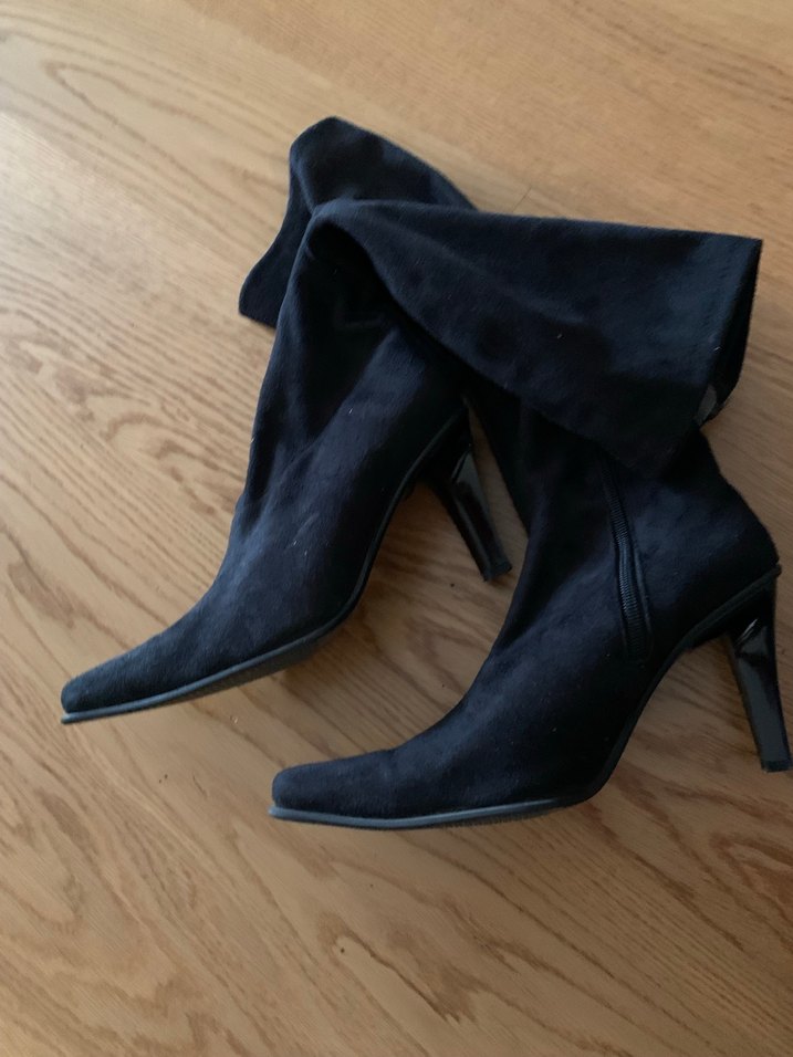 Siyah süet dizüstü, ince topuklu ve tokalı kadın çizme, klasik şık ofis kombinleri için uygundur.