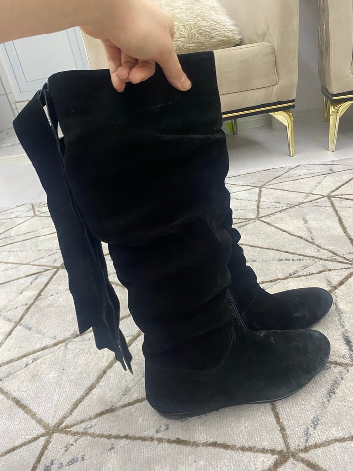 Siyah süet dizüstü, stiletto topuklu, tokalı kadın çizme. Günlük kullanıma uygun, rahat ve desensizdir.