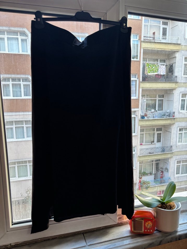 Siyah süet kumaştan, dökümlü ve bol kesim uzun gotik etek, ofis kullanımı için uygun.