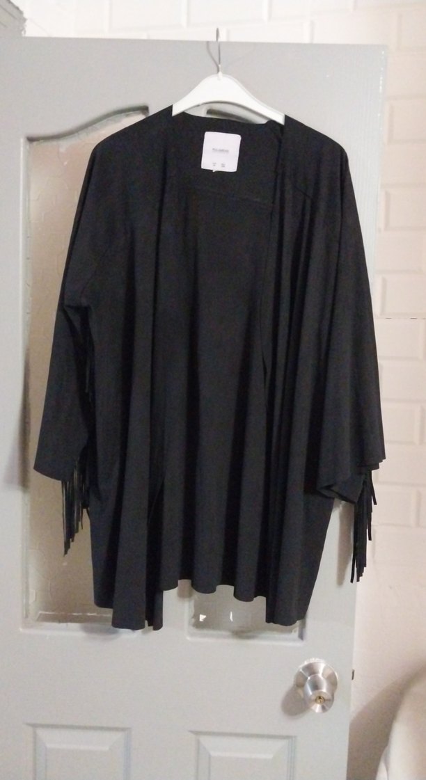 Siyah süet kumaştan yapılmış, dökümlü ve bol kesimli kadın pelerinidir. Uzun kollu, bisiklet yaka ve midi boydadır. Günlük kullanım için uygundur.