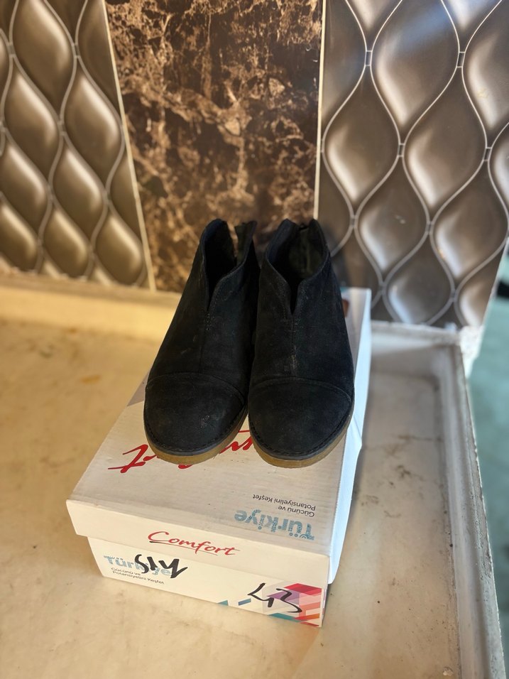 Siyah süet malzemeden yapılmış, fermuarlı dolgu topuklu botlar. Rahat ve normcore tarzıyla günlük kullanıma uygundur. 'Corrfort' markalıdır.