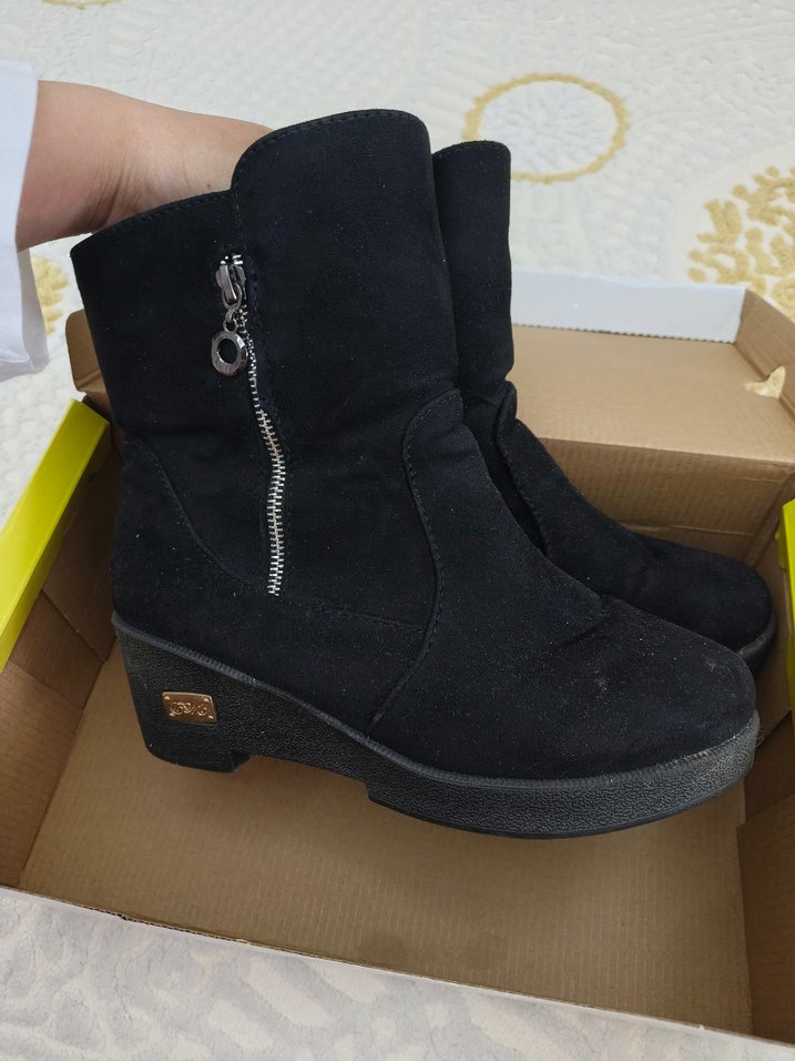 Siyah süet dolgu topuklu botlar, fermuar ve tokalı detaylara sahip, trend sokak stili için uygundur. Günlük kullanıma rahat.Yurt dışı ürünü