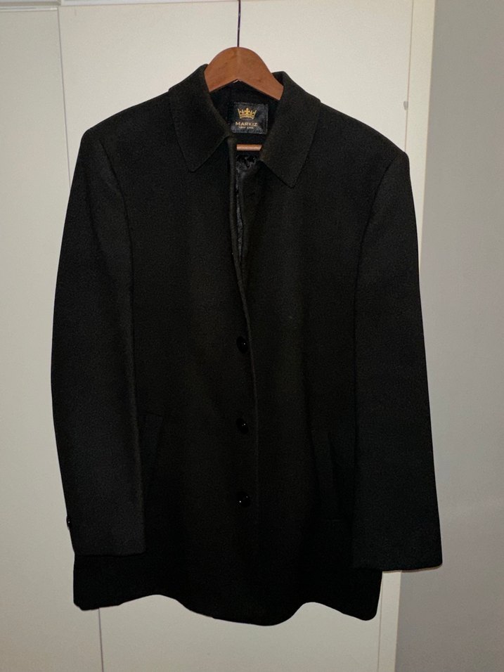 Siyah süet erkek Kaban, düğmeli, normal boyda ve notched yaka detayına sahiptir. Uzun kollu ve düz desensiz tasarımıyla ofis ve sokak stiline uygundur.