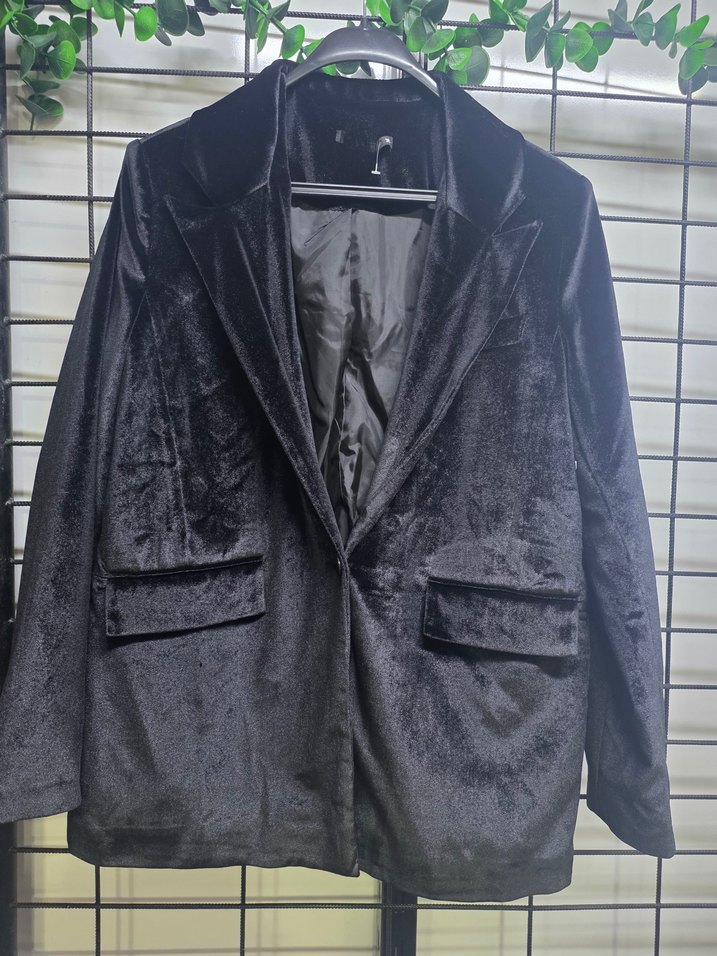 Siyah süet kumaştan, notched lapel yakalı, uzun kollu ve düğmeli kadın blazer ceket. Düzenli kesim ve midi boyda, ofis için uygun goth iş tarzında, desensiz şık bir model.