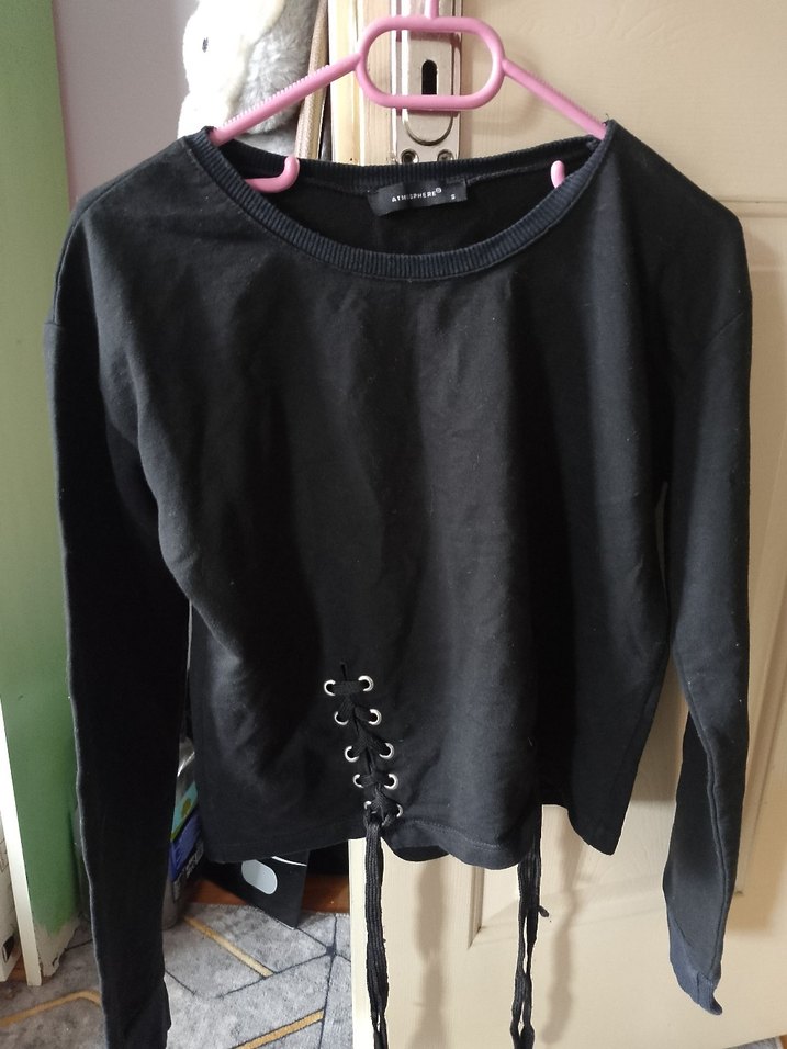 Siyah süet kumaştan, uzun kollu ve yuvarlak yakalı, düğmeli detaylara sahip bol kesim kadın sweatshirtü. Goth ve grunge tarzına uygun. S-M beden uyumludur.