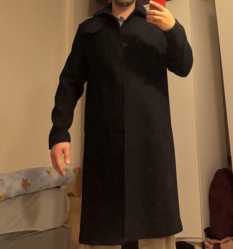 Siyah süet kumaştan yapılmış, düğmeli ve normal kesim midi uzunlukta erkek kaban. Uzun kollu ve klasik gotik tarzda, ofis kullanımı için uygun. 2 adet iç cebi de mevcuttur hiç giyilmedi. HM markadır pazarlık payı var