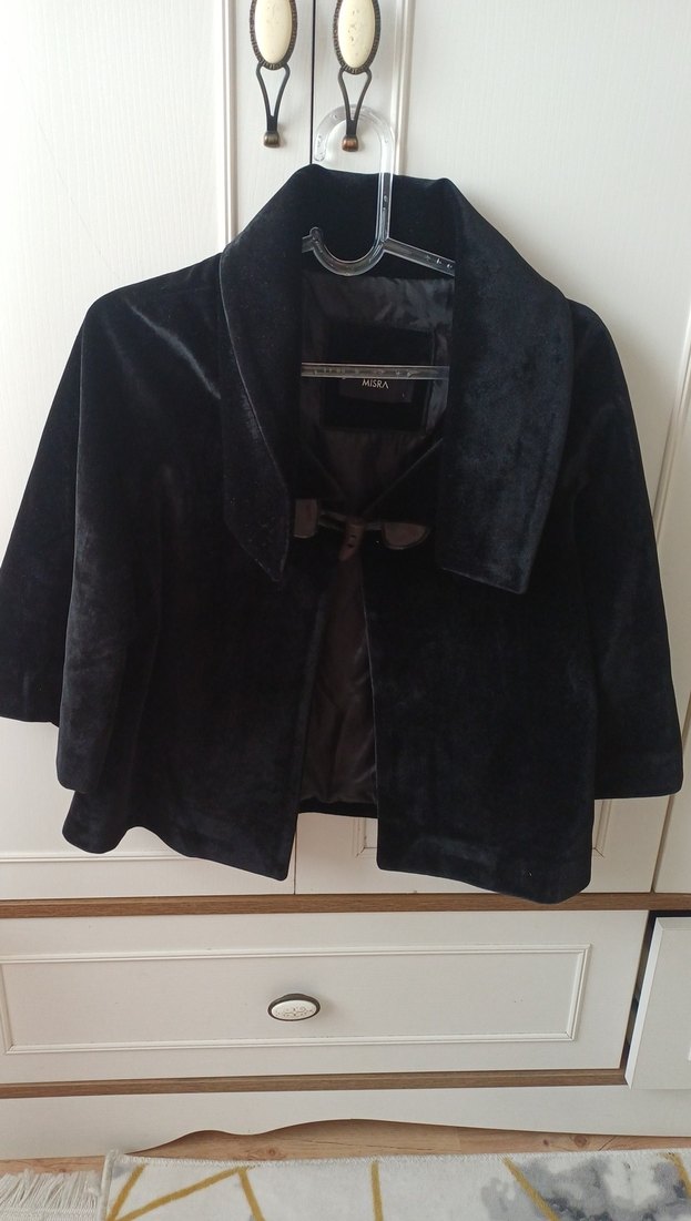 Uzun kollu, düğmeli siyah süet ceket, klasik ve şık bir görünüm sunar. Normal boyda, Paris tarzı gotik detaylara sahiptir.