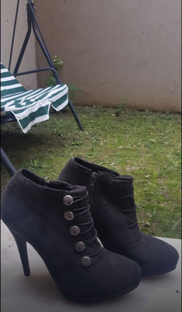 Siyah süet, düğmeli ve yan fermuarlı, stiletto topuklu bilekte botlar. Sokak stili ve dış mekan için uygundur.
