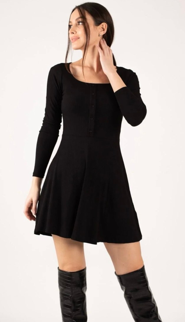 Siyah Süet Düğmeli Uzun Kollu Mini Elbise
