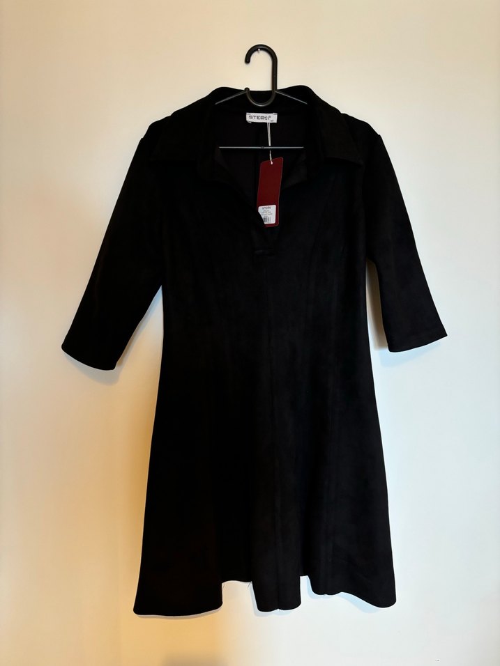 Siyah süet kumaştan, yumuşacık şık elbise. Günlük veya özel günde kullanılabilirsiniz. M beden fakat L bedene de uyar diye düşünüyorum. Çok beğenerek aldım fakat denemeden almıştım bana büyük geldiği için giyemiyorum etiketi üstünde daha hiç kullanılmadı. Benim boyum 1.66 kilom 58 kendi bedeninize göre ordan hesaplayabilirsiniz.