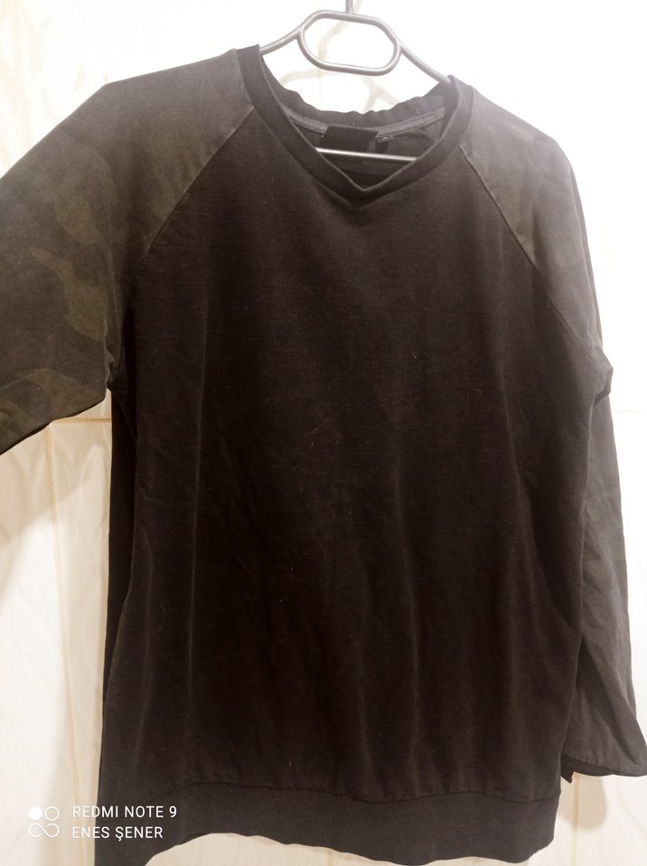 Kolları askeri yeşil detaylı siyah süet kumaştan, yuvarlak yaka ve uzun kollu kadın sweatshirt. Salaş kesimi ve normal boyuyla rahat ve şık bir günlük giyim ürünü.