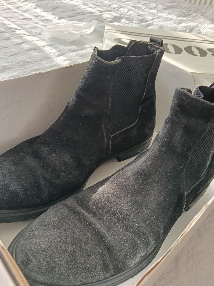 Tokalı siyah süet erkek botları, desensiz ve günlük sokak stiline uygun. Rahat ve trend bir seçenek.
