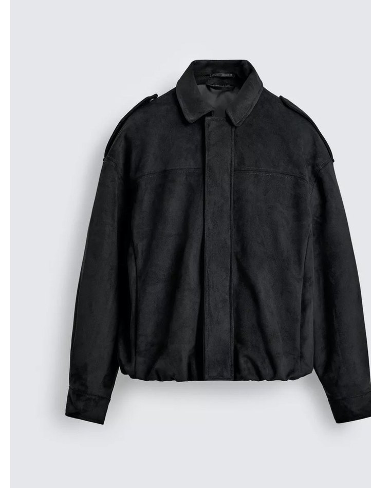 Siyah süet kumaştan, uzun kollu ve kemerli, normal kesim, yakalı minimalist erkek ceket. Günlük kullanıma uygun şık ve rahat.