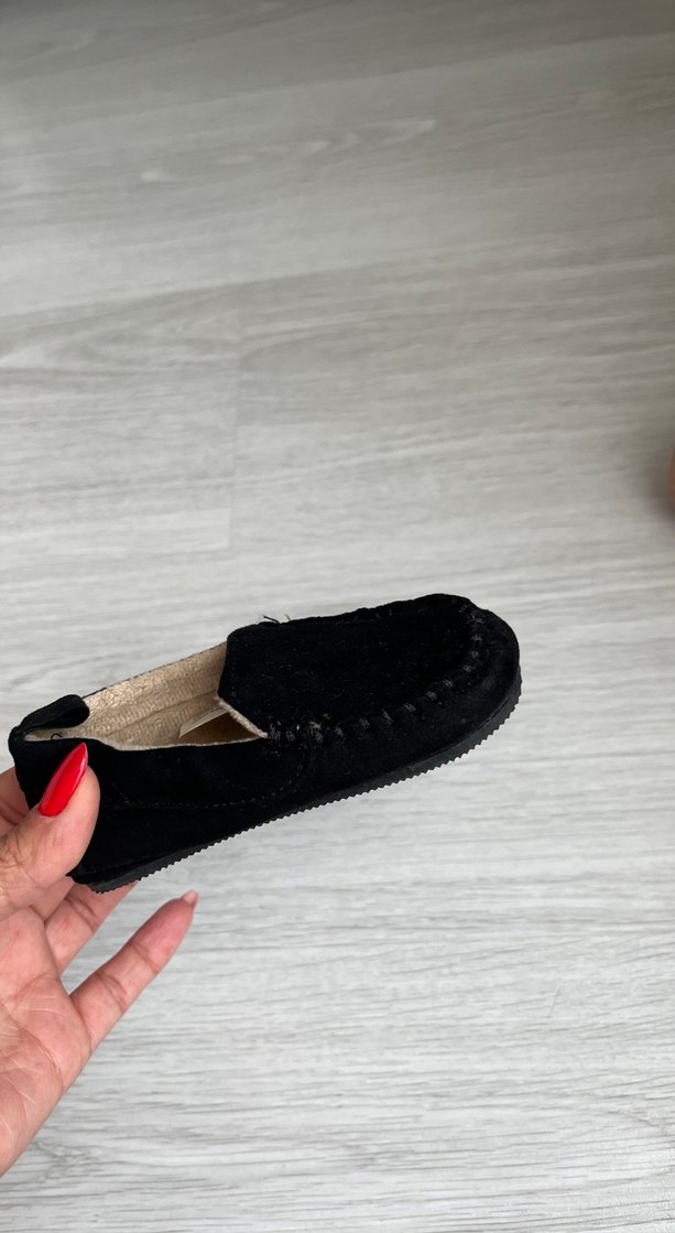 Siyah süet erkek çocuk loafer, iç kısmı kürklü olup yumuşak ve rahat bir kullanım sunar, sade ve bohem tarzda.