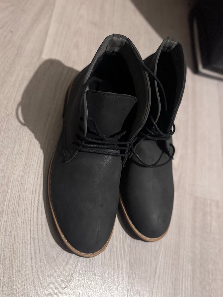 Siyah süet malzemeden yapılmış, desen içermeyen, minimalist ve sokak tarzı erkek botları. Günlük kullanım için rahat ve şık bir seçenek.