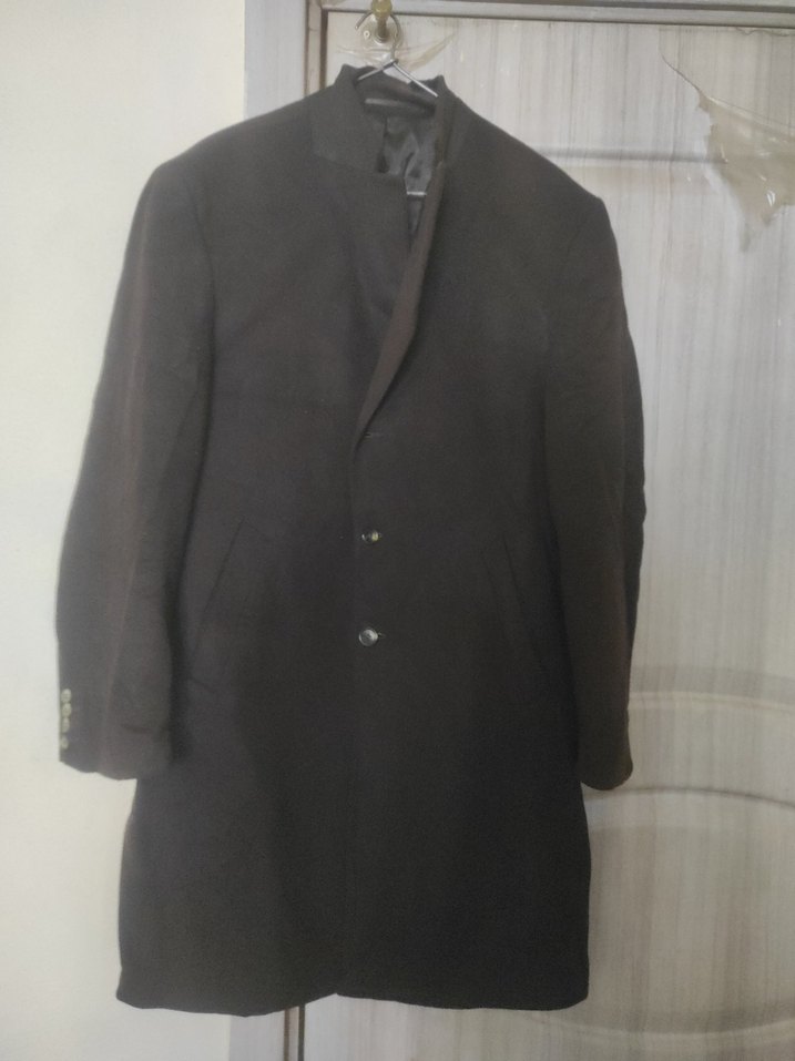 Siyah süet kumaştan yapılmış, klasik kesim ve düğmeli, uzun kollu erkek midi kaban. Ofis için uygun şık ve sade bir modeldir.