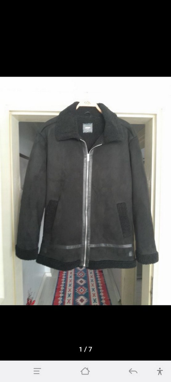 Siyah süet, fermuarlı ve cepli, normal boy uzunlukta erkek ceket. Notlu yaka ve uzun kollu, günlük sokak stili için uygun.
