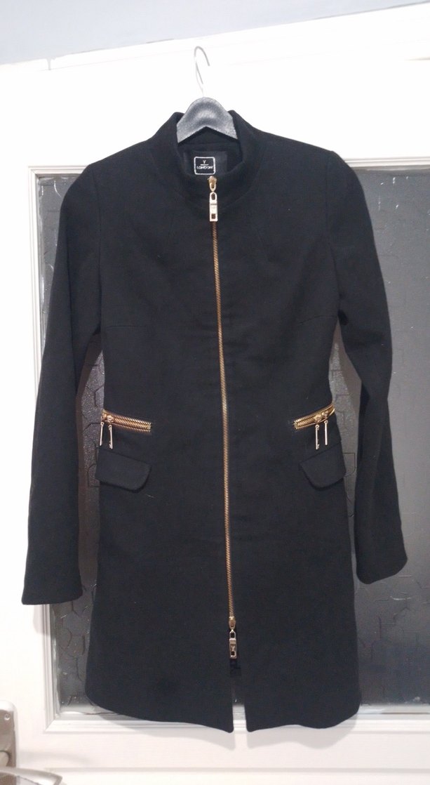 Siyah süet kumaştan, fermuarlı ve kesimli midi uzunlukta kadın kaban. Notlu yaka ve uzun kollu, günlük kullanıma uygun şık tasarım.
