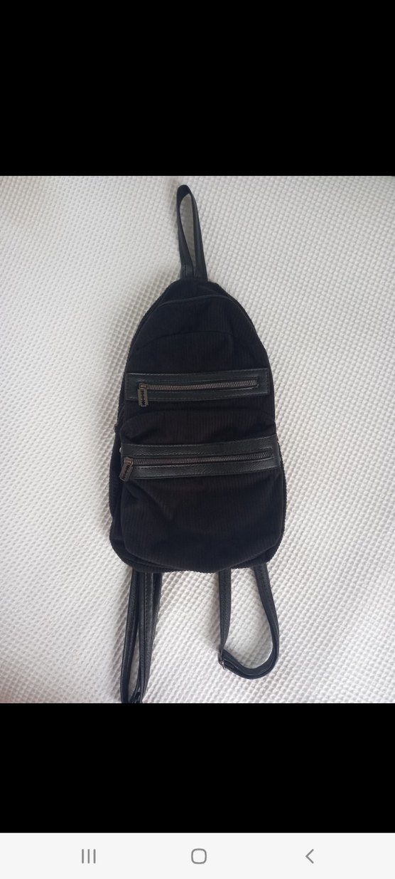 Siyah süet materyalden yapılmış, fermuarlı cepleri olan minimalist gotik tarzda kadın sırt çantası. Günlük kullanıma uygundur.