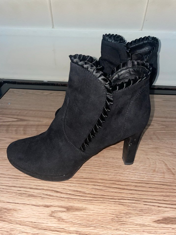 Siyah süet kadın botları, yüksek topuklu ve fırfır detaylıdır. İnce nakış deseniyle gotik tarzda şık bir görünüm sunar. Topuklarından anlaşılacağı üzere sadece bir kere giyildi.